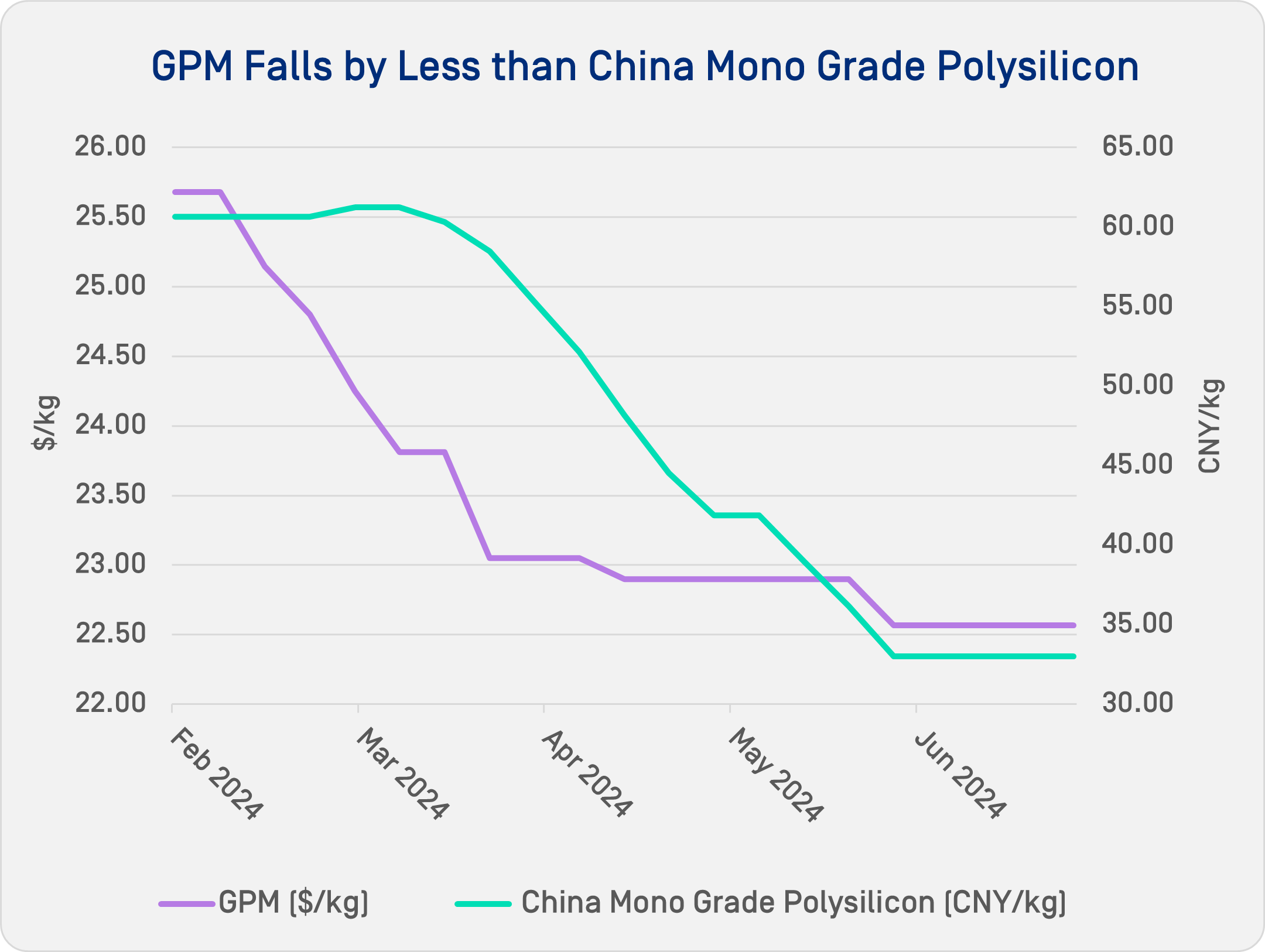 From January 2024 to Jul 2024, the GPM has fallen by around 14% while the domestic price of Chinese polysilicon has fallen by a far steeper 46%, reinforcing the fact that there is no single one-size-fits-all price assessment that can reflect all markets.