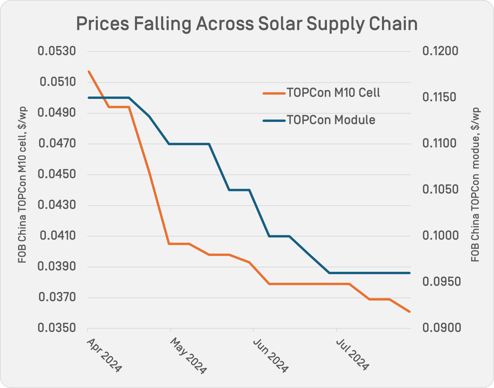 From April to July 2024, export prices of FOB China TOPCon M10 modules have fallen by 17% to $0.096 per watt peak (wp), the result of a Chinese solar industry struggling to arrest a downward spiral of growing overcapacity and ruinous price cuts.