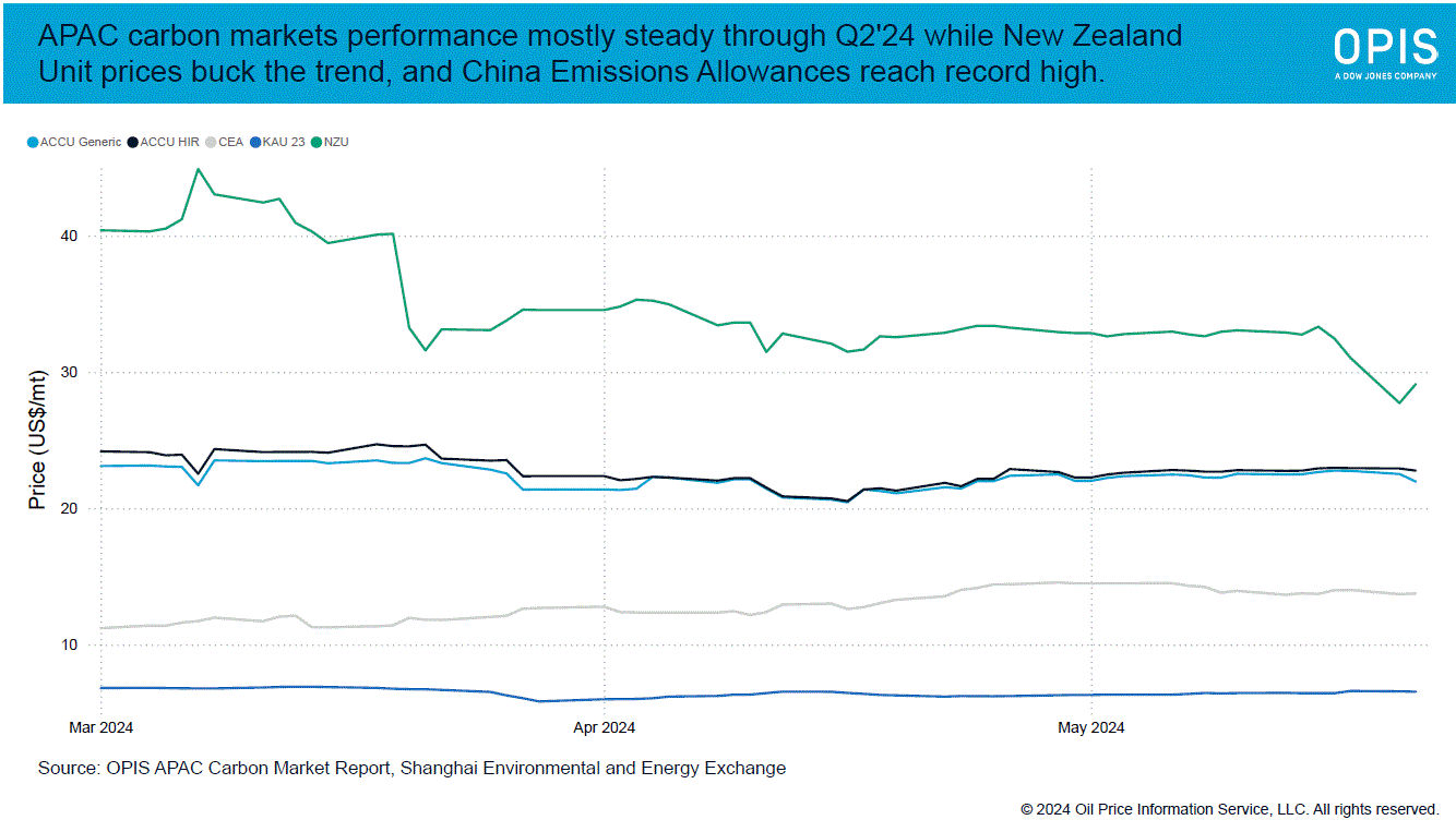 The NZU market experienced another significant price drop in late May, reaching a near ten-month low of NZ$45.23/mt (US$27.61/mt) on May 20, according to OPIS price assessments. This plunge followed the government’s proposal to lower auction volume as well as the auction price floor starting next year. The move stirred frustration and increased policy doubts among market participants due to a perceived lack of clarity and rationale behind lowering the price control settings.