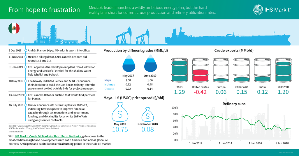 A sense of hope emerged for many Mexicans when Andrés Manuel López Obrador (AMLO) won the presidential election in July 2018. But frustrations have set in, particularly when it comes to the oil market.